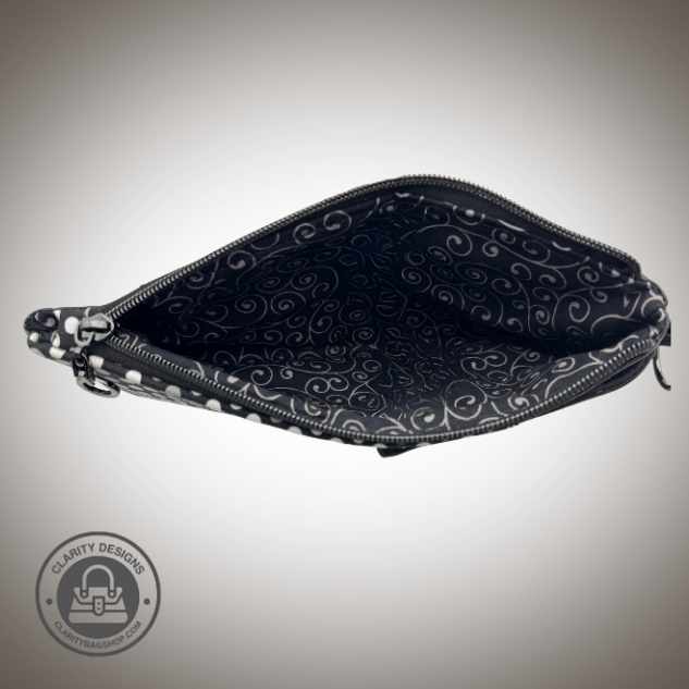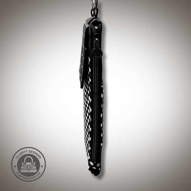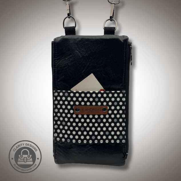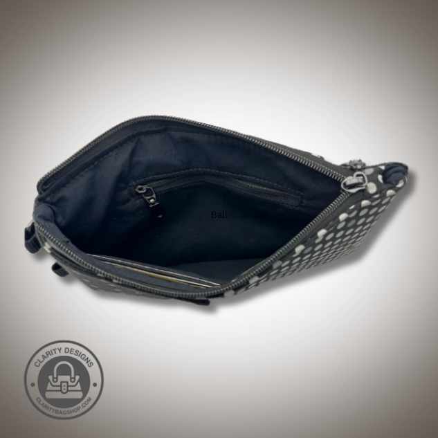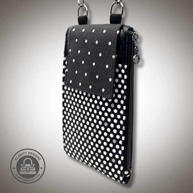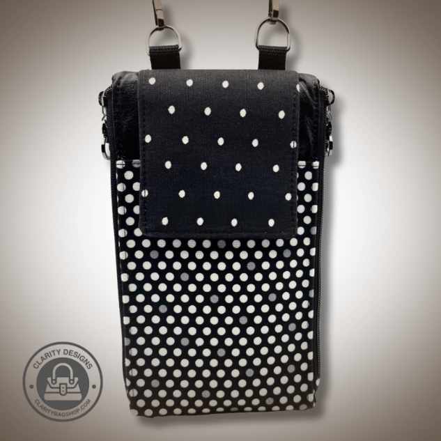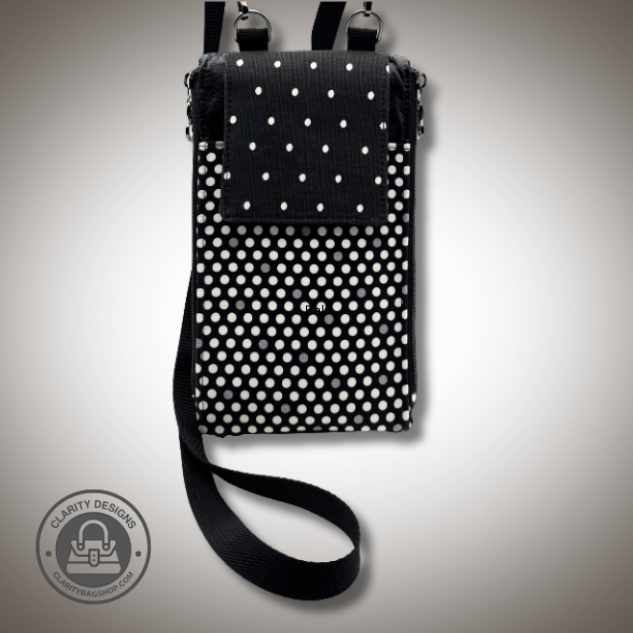 - DESIGN This bag reflects my love of POLKA DOTS, with simple black, white and gray colors. Gunmetal hardware accents the bag. Made with cotton canvas and vinyl, and water resistant, and adjustable black strap webbing.