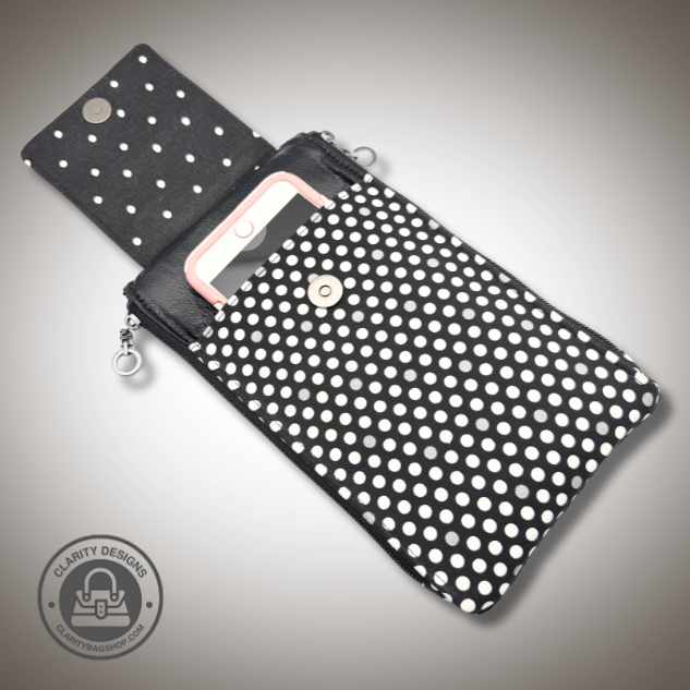 - FRONT OUTSIDE of bag has a pocket with a magnet flap on top to keep phone secure in the pocket below. Cell phone pocket will fit cell phones measuring 3” W, 6 & ½”, ¼” D, and other cell phones of similar size