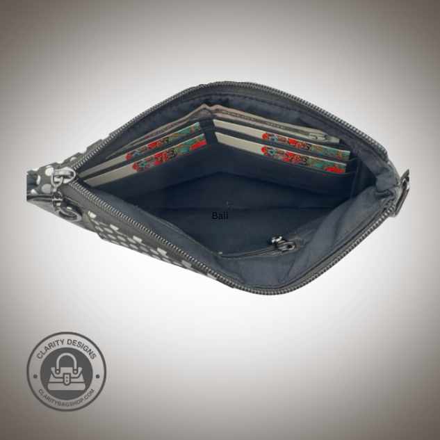 - INSIDE ONE SIDE VERTICAL ZIPPER has 4 credit card slots, with one bill slot above. You can double up credit cards in each slot to carry 8. Across from the credit card and dollar slots is a small, zippered coin pocket.