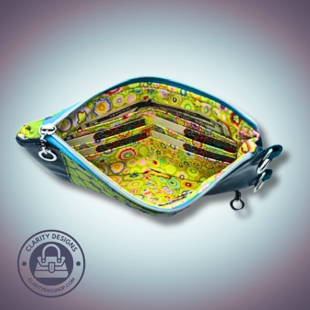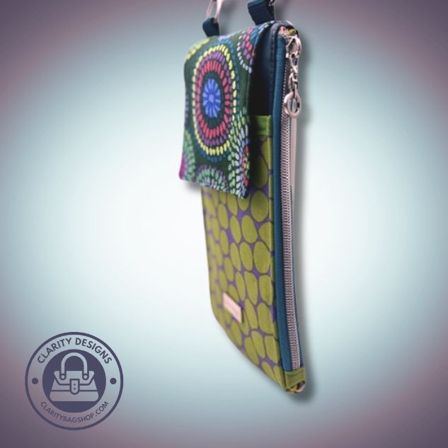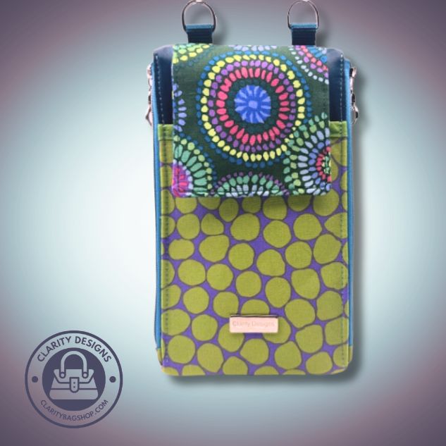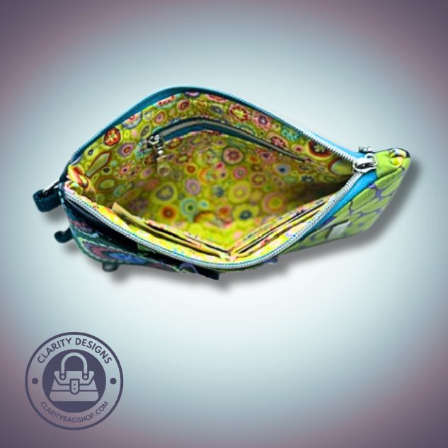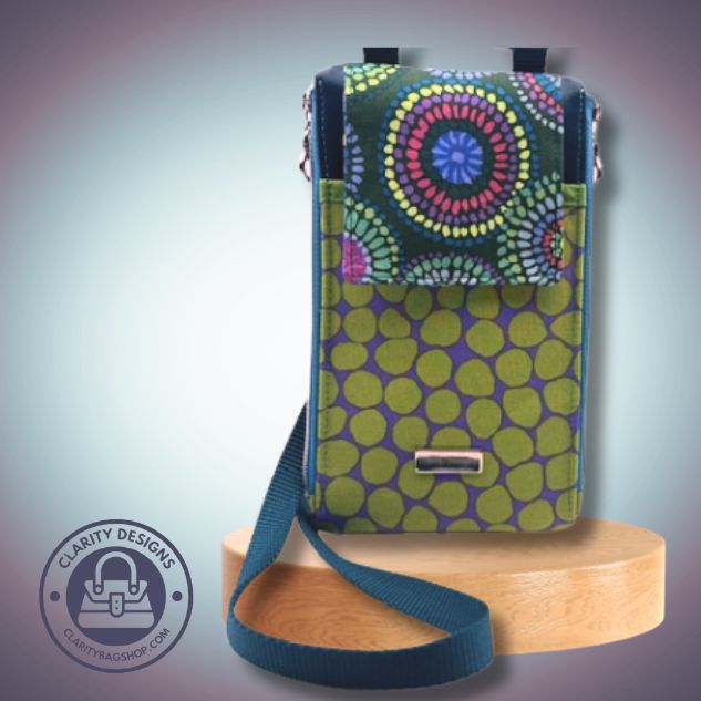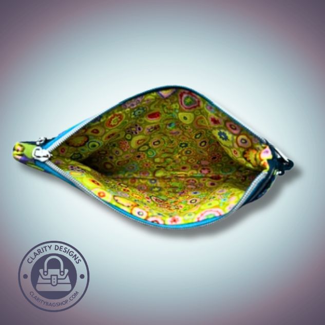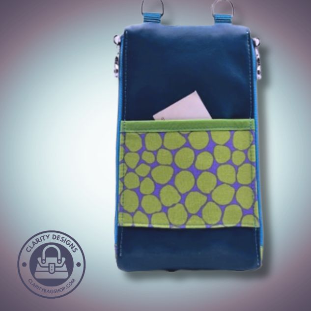 - DESIGN Made with fabrics of vinyl, cotton designed by Kaffe Fasset, and water resistant. For this bag, my love of color, shapes and textures inspires me. Colors are various greens, purple, blue, turquoise and pink introduce eye candy along with pretty patterned material, with green adjustable strap. Nickel silver hardware compliments all the colors, texture, and fabric pattern.
