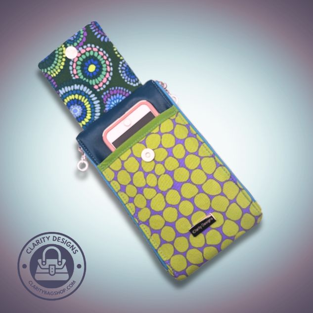 - FRONT OUTSIDE of bag has a pocket with a magnet flap on top to keep phone secure in the pocket below. Cell phone pocket will fit cell phones measuring 3” W, 6 & ½”, ¼” D, and other cell phones of similar size