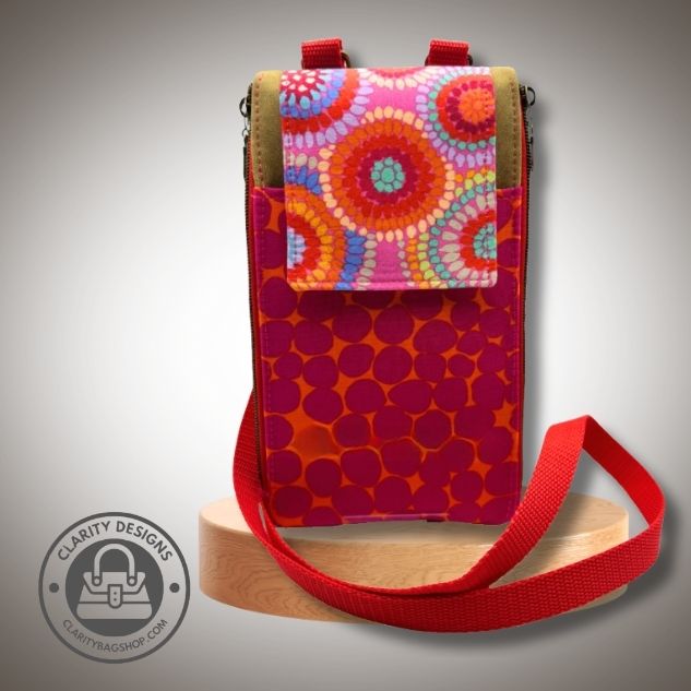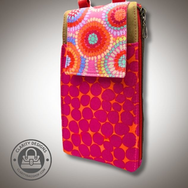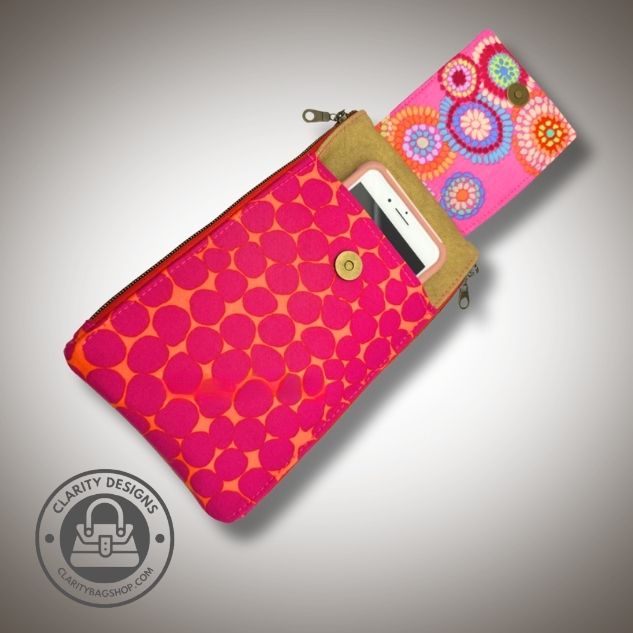 - FRONT OUTSIDE of bag has a pocket with a magnet flap on top to keep phone secure in the pocket below. Cell phone pocket will fit cell phones measuring 3” W, 6 & ½”, ¼” D, and other cell phones of similar size