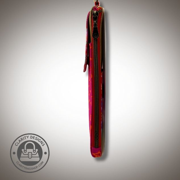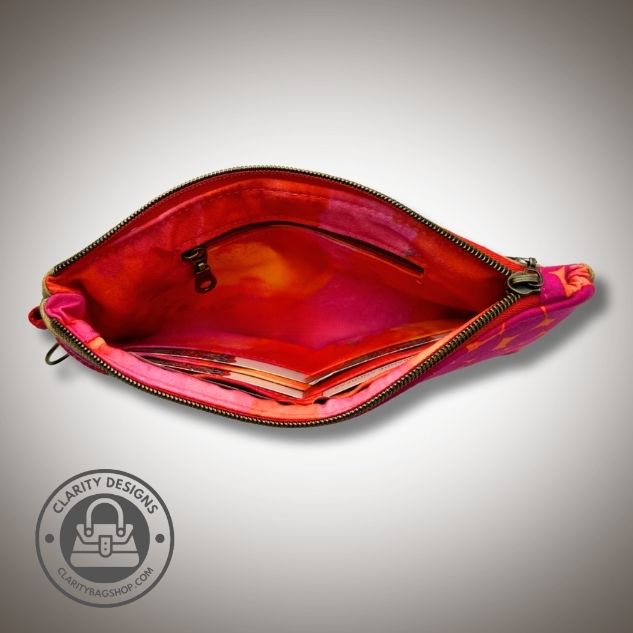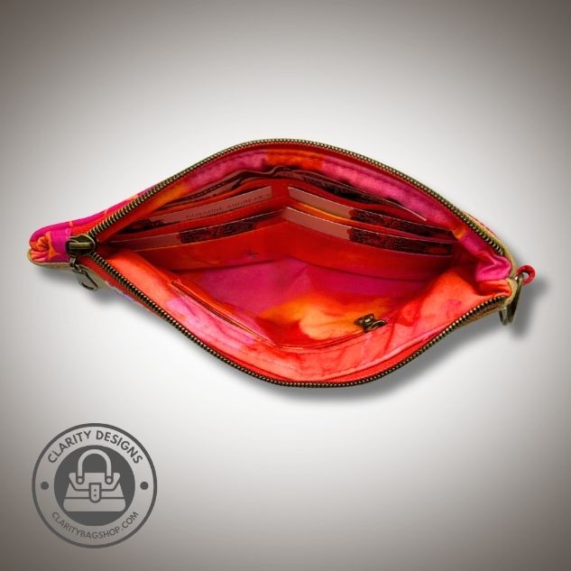 Fabrics used are a painter’s pallet to me. Each bag is a beautiful one-of-a-kind piece of art created with fabrics from leading fabric designers. I use strong interfacings and stabilizers to create a strong long lasting functional bag, along with quality hardware.